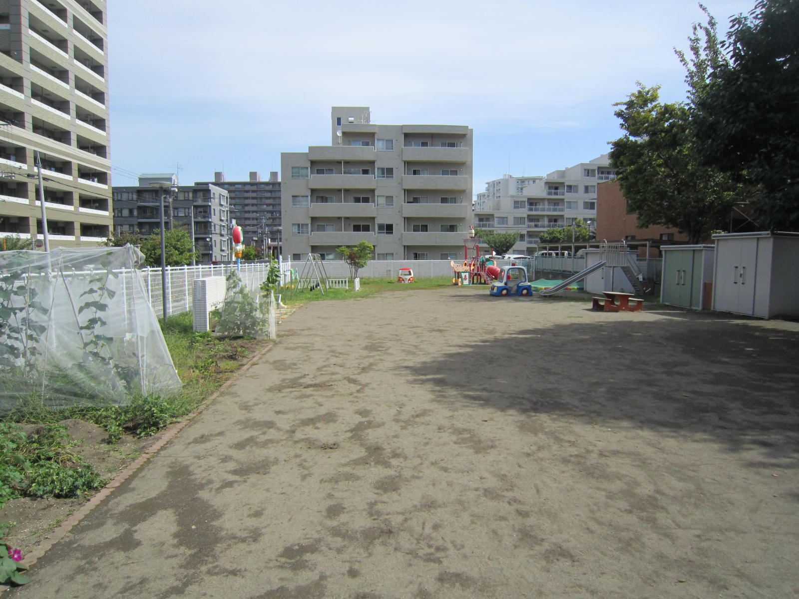 広い園庭は開放的な環境となっていて、定期的に抗菌作業をおこなっている砂場の他、保育園児専用の遊具があり、安全面や衛生面等が保障された環境の中で子どもたちはびのびと遊んでいます。また食育として菜園のスペースがあります。毎年年長のクラス全員で近隣のホームセンターに苗を買いに行き、3才以上のクラスで植えています。当園は幼児の園庭とは別に乳児(0才1才児用)専用の園庭もあります。幼児の園庭とはコンセプトを変え、安全面の他、衛生的にも保障された環境の中で、砂場あそびや、散策など自然に触れながら子ども達は遊んでいます。