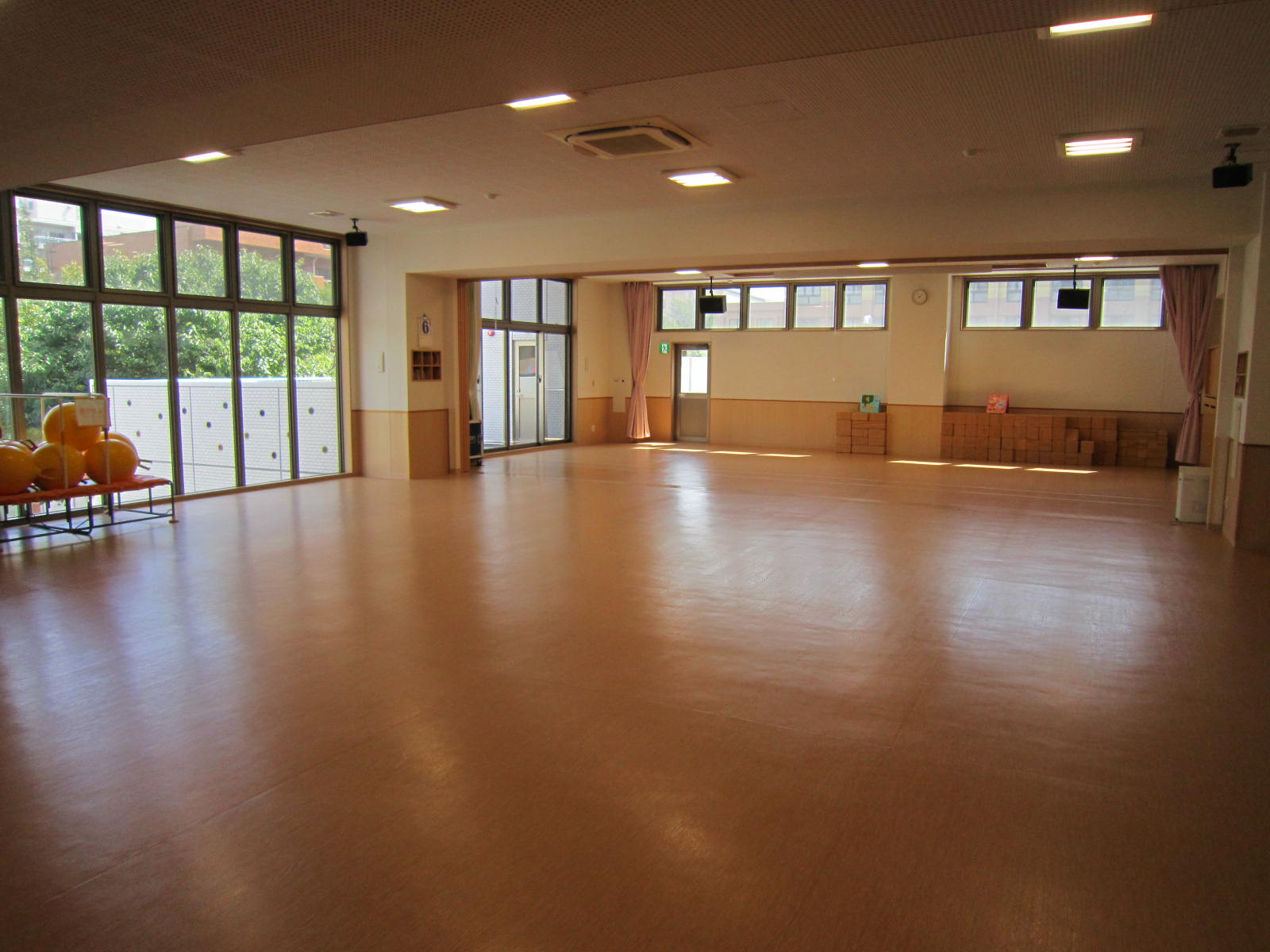 明るく広い遊戯ホールは、園児にとって安全性や快適性を重視し、元気いっぱいに楽しめる空間となっています。屋内の年間行事(誕生会、発表会、卒園式他)はこの遊戯ホールで行われています。
