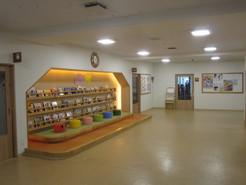 お迎え時等に保護者の方がお子さんの好きな絵本を読んであげたり、日中は保育を通じて、子どもたちが自分で読みたいと思った本を選んで読むことができる環境を整えています。また、ステージのように見えるこの図書コーナー前で0才1才児の行事が行われることもあります。